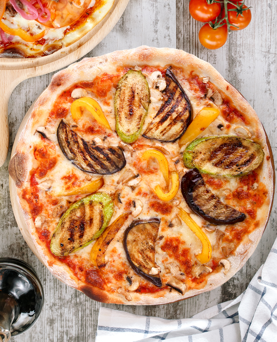 mozzarella, bostănel, vânătă, ardei gras, ciuperci