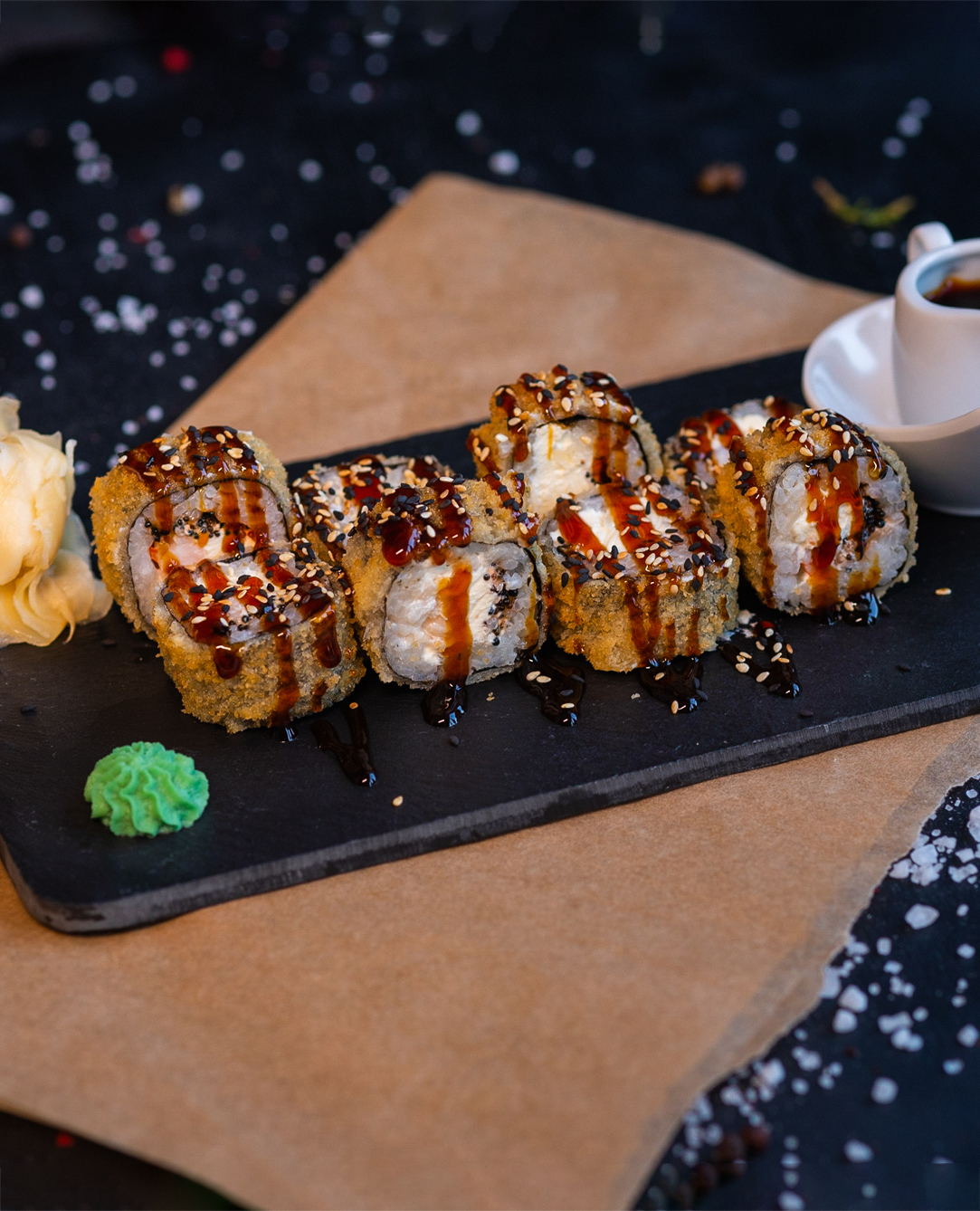 Creveti, icre Tobiko, unagi, cream cheese, susan